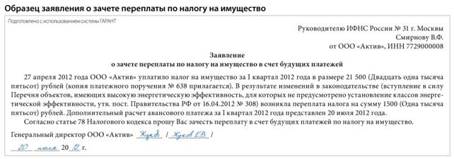 В январе 2012 г. компания ввела в эксплуатацию энергоэффективное основное средство — легковой автомобиль малого класса с кузовом «универсал» (позиция 99 Перечня). Сумма начисленного по нему налога на имущество — 1500 руб. Переплату, полученную в связи с вступлением в силу Перечня, решено зачесть в счет будущих платежей.