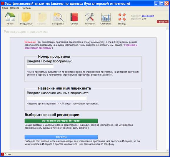 3. Введите серийный номер программы, название фирмы или Ф.И.О. покупателя (лицензиата) и выберите вариант регистрации – автоматически через Интернет или вручную. При автоматической регистрации программа сама через Интернет получит регистрационный код и станет полнофункциональной.