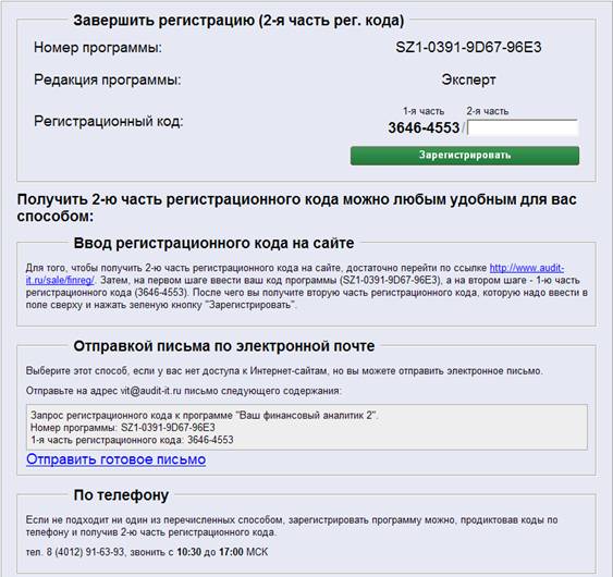 На этой странице уже содержится 1-я часть регистрационного кода, а вам необходимо ввести 2-ю часть. Получить её можно у разработчика, предоставив номер программы и 1-ю часть кода любым удобным для вас способом: