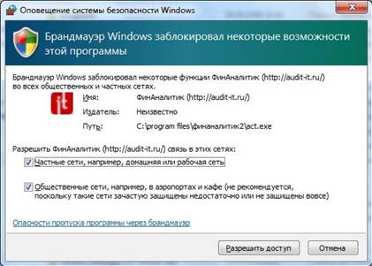 Внимание: Если на ПК, где запущен сетевой вариант программы, стоит Firewall, то при обращении к программе пользователей из сети появится запрос Firewall'а на разрешение сетевой активности. Необходимо дать такое разрешение. Например, Windows Vista/7 выдает такой запрос на сетевую активность (нужно поставить галочку "Разрешить ФинАналитик…"):