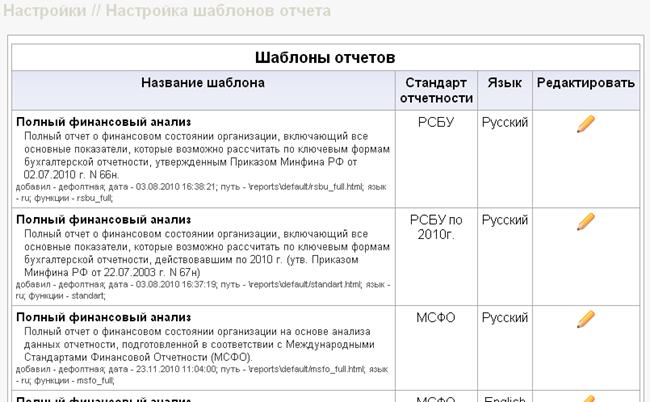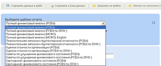 • возможность выбора различных шаблонов отчета: "Полный финансовый анализ", "Пояснительная записка к бухгалтерской отчетности", "Сертификат рейтинга финансового состояния", "Документы стоимости организации";