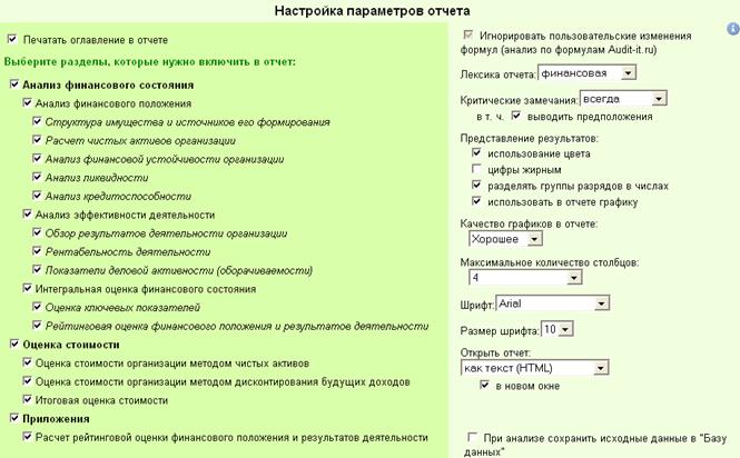 • возможность выбирать различные параметры отчета: формируемые разделы и подразделы, стили используемой в комментариях лексики, уровень использования в отчете критики и т.п.;