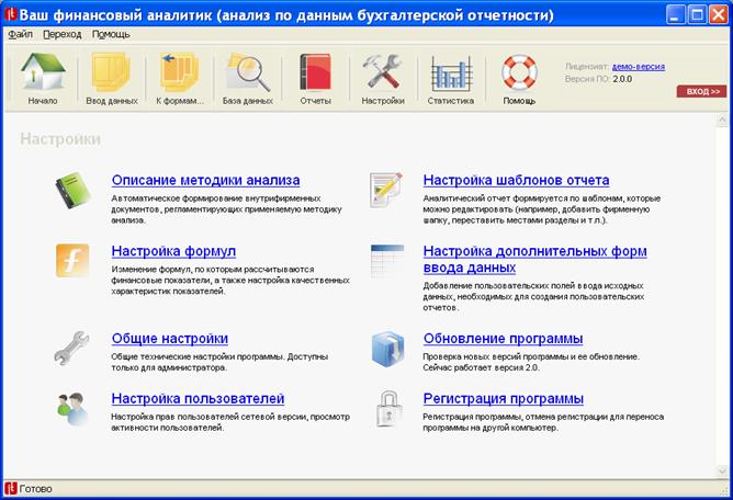 • в программу заложена возможность редактирования и создания шаблонов, добавления данных для анализа и формул расчета;