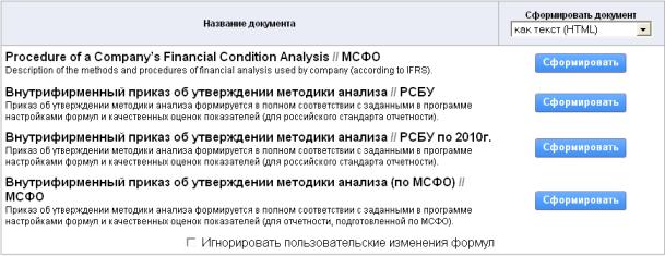 • автоматически формируется документ "Внутрифирменный приказ об утверждении методики анализа", который описывает методику финансового анализа, заложенную в программе (при этом учитываются сделанные пользователем изменения в формулах расчета показателей);